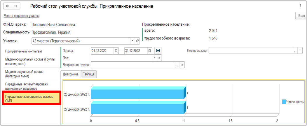 В разделе «Переданные завершенные вызовы СМП» отображается оперативная информация о переданных завершенных вызовах СМП по контингенту участкав виде графика и таблицы с детализацией информации по пациентам (рис. 1.24, 1.25, 1.26).