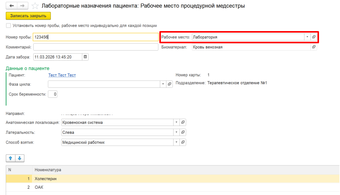 Если же ситуация, что какое-то одно из назначенных исследований нужно отправить в ЦКДЛ, а остальные выполнить на месте, то необходимо установить галочку в форме элемента, которая убирает из шапки номер пробы и рабочее место и переносит их в Табличную Часть, чтобы можно было менять у каждой номенклатуры. Тогда можно у одной внести номер пробы, поменять рабочее место, а по остальным создать мед. документ.