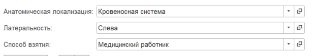 В открывшейся форме необходимо заполнить поля «Анатомическая локализация», «Латеральность», «Способ взятия». В поле «Латеральность» по умолчанию отображается значение «Слева», в поле «Способ взятия» по умолчанию отображается значение «Медицинский работник», в поле «Анатомическая локализация» по умолчанию отображается значение из последнего документа Заказ на лабораторные исследования (если ранее сотрудник не формировал заказ, поле будет пустым). При необходимости в указанных полях выбрать другие значения. Заполнить необходимые поля, нажать кнопку «Записать и закрыть».