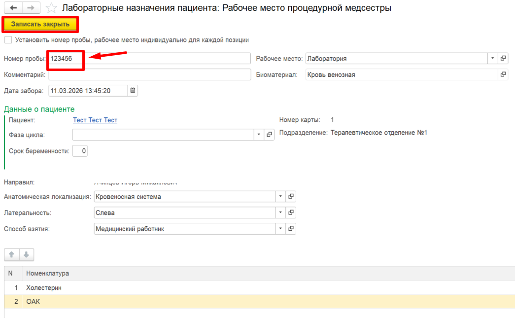 Взяв биоматериал у пациента процедурная медсестра наклеивает штрихкод на пробирку с биоматериалом данного пациента и вносит этот же штрихкод в форму «Лабораторные назначения пациента» в поле «Номер пробы».