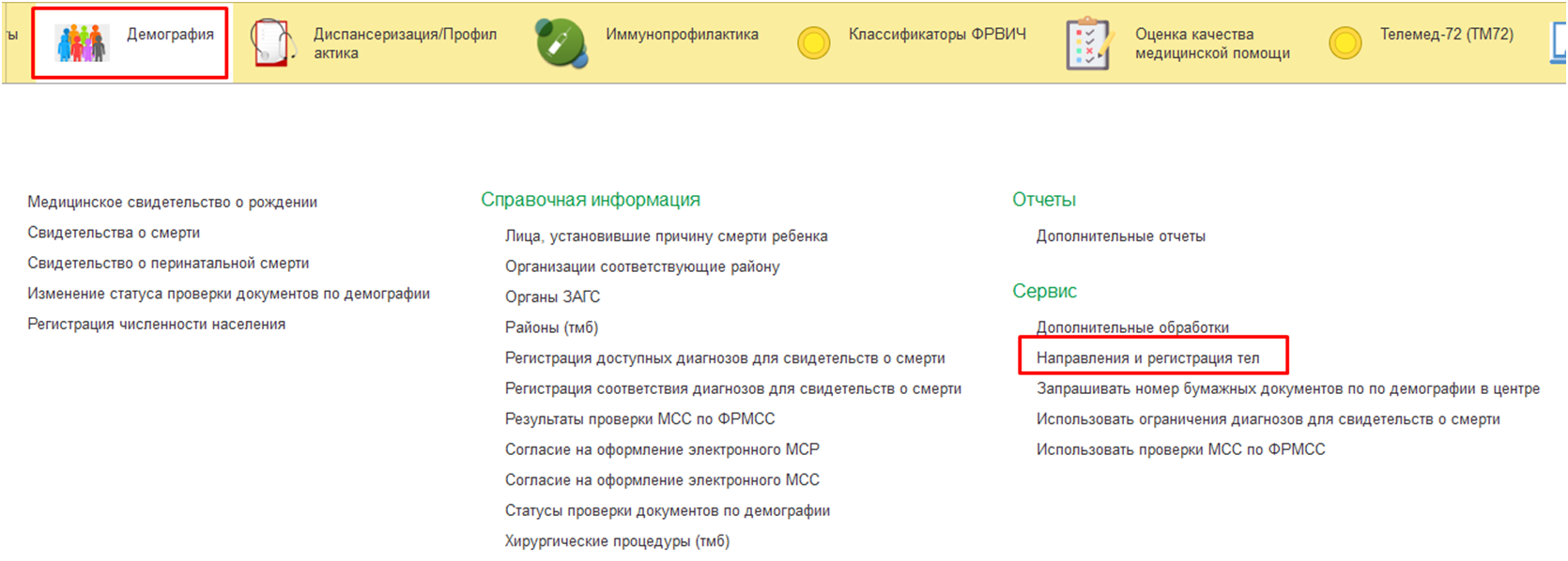 Пользователю под профилем Врач стационара / Врач амбулатории зайти в подсистему Демография – Направления и Регистрация тел.