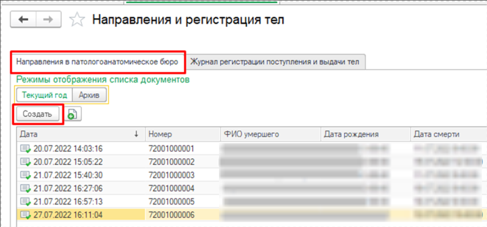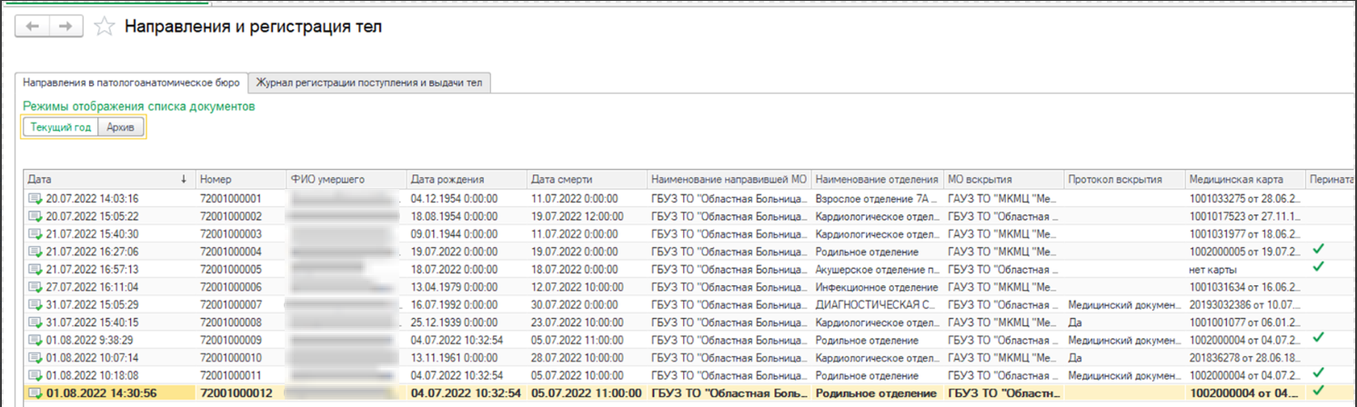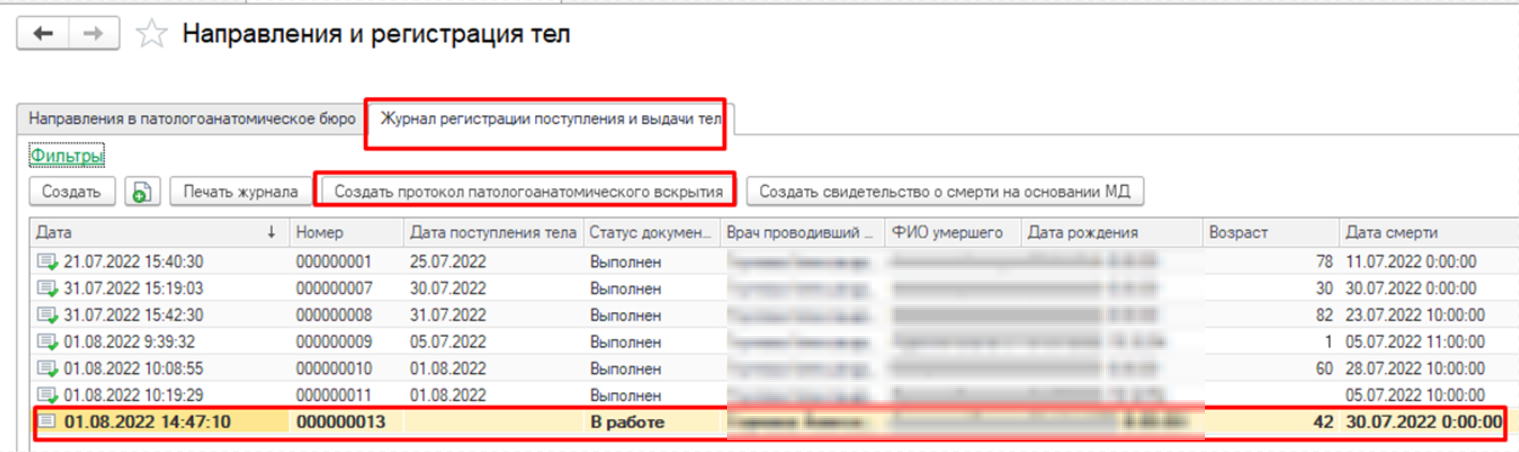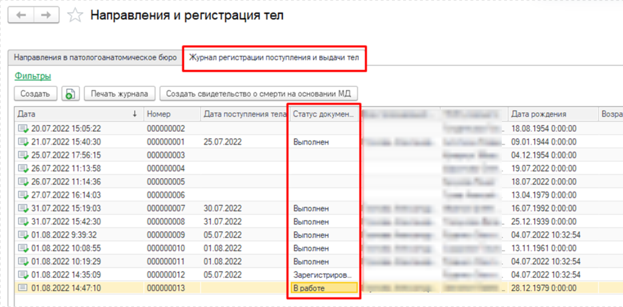 Заполнить документ и нажать «Провести». Если документ Регистрация поступления и выдачи тела проведен, но врач не назначен, данный документ отображается на вкладке «Журнал регистрации» со статусом «Зарегистрирован». Зайти в документ и в поле «Назначенный врач» выбрать врача из справочника «Сотрудники», нажать «Провести и закрыть». В этом случае документ отображается на вкладке «Журнал регистрации» со статусом «В работе». Если назначение врача было произведено сразу при формировании документа Регистрация поступления и выдачи тела, промежуточного статуса «Зарегистрирован» не будет. После того, как врач сформирует и приведет в готовность ШМД Протокол патологоанатомического вскрытия, в Журнале регистраций для данного документа будет статус «Выполнен» (рис.8). С документа Направление, на основании которого создан документ Регистрация поступления и выдачи тела, выделение шрифтом снимается.