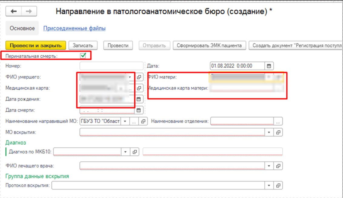 При установке отметки «Перинатальная смерть» откроются дополнительные поля для указания ФИО матери и медицинской карты матери. Если в системе есть документы Регистрация новорожденного / мертворожденного, данные по ребенку подтянутся в направление (рис.5)