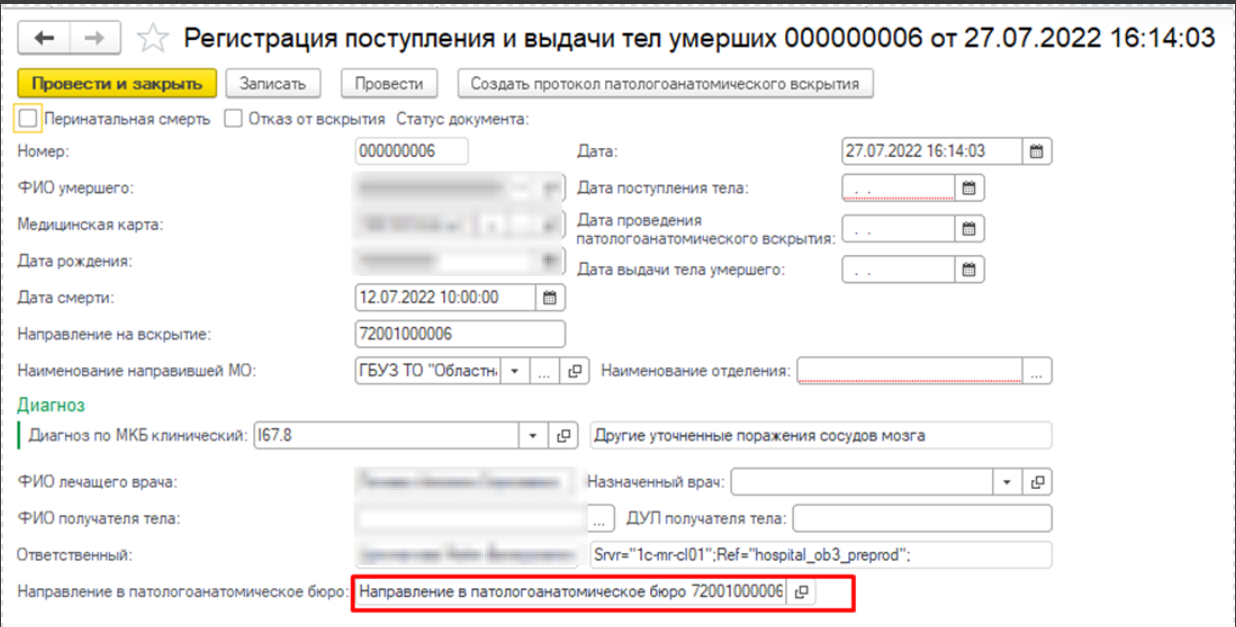 Заполнить открывшийся документ «Протокол патологоанатомического вскрытия», выполнить команду «Документ готов». Сформирован ШМД Протокол патологоанатомического вскрытия. Статус документа Регистрация поступления и выдачи тела на вкладке «Журнал регистрации» стал «Выполнен», снято выделение шрифтом.