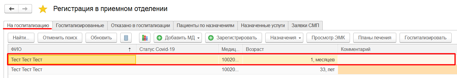 В списке пациентов на госпитализацию, выбрать нужного пациента и открыть документ «Поступление пациента в стационар» путем двойного нажатия по пациенту.