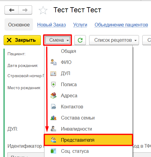 В открывшейся форме основных данных пациента выполнить команду «Смена» - «Представителя».