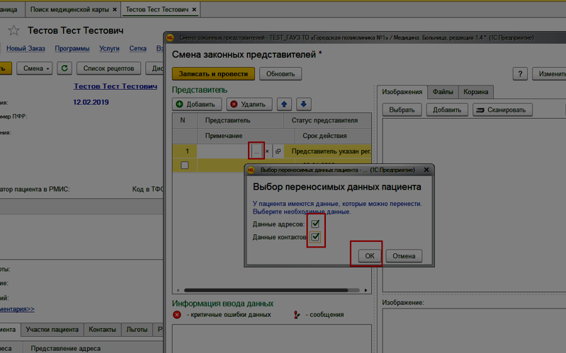 В открывшейся форме «Выбор переносимых данных пациента» в случае необходимости переноса сведений представителя установить галочку в полях «Данные адресов» и «Данные контактов» и далее выполнить команду «ОК».