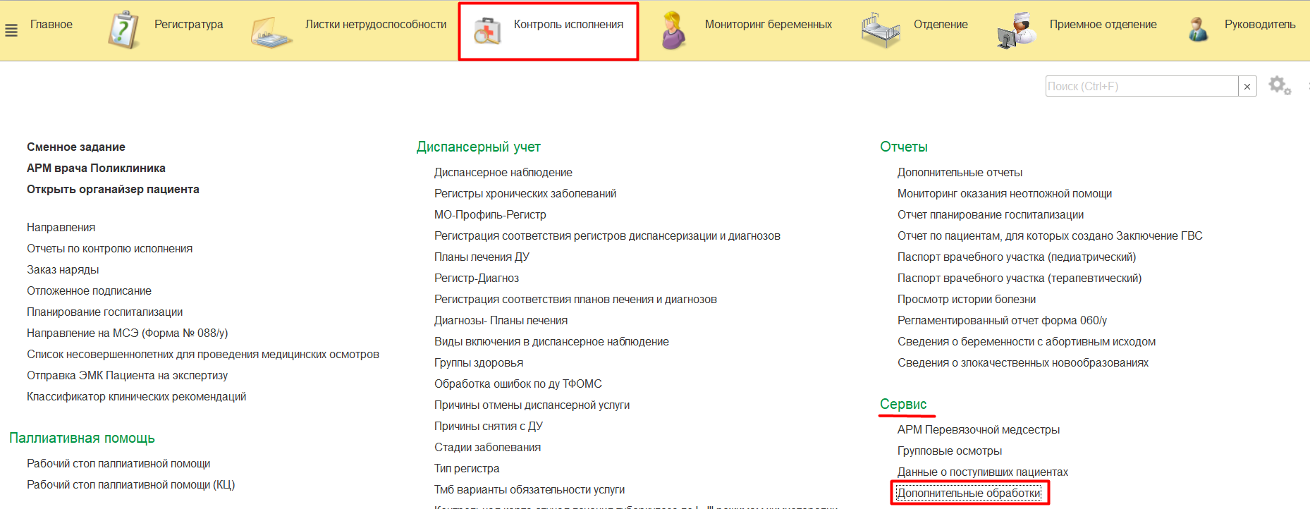 Для отправки медицинских документов пациента в ФРБТ необходимо зайти в подсистему «Контроль исполнения» и в разделе «Сервис» перейти по ссылке «Дополнительные обработки»