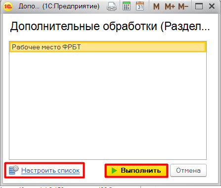 В открывшемся окне «Дополнительные обработки» следует найти обработку «Рабочее место ФРБТ» и нажать кнопку «Выполнить». Если обработка не отображается в списке «Дополнительные обработки», то нужно найти её через «Настроить список».