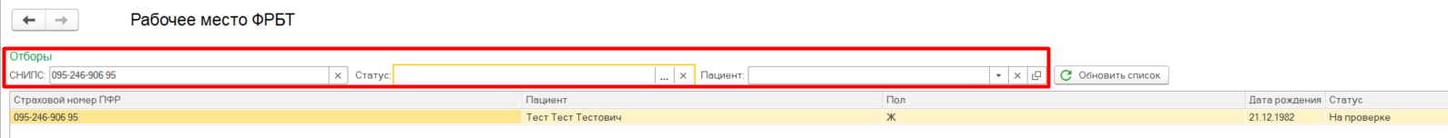 Рабочее место ФРБТ представлено в виде списка пациентов, со статусами для отправки ФРБТ, кроме того имеются поля фильтров по статусу, пациенту и СНИЛС.