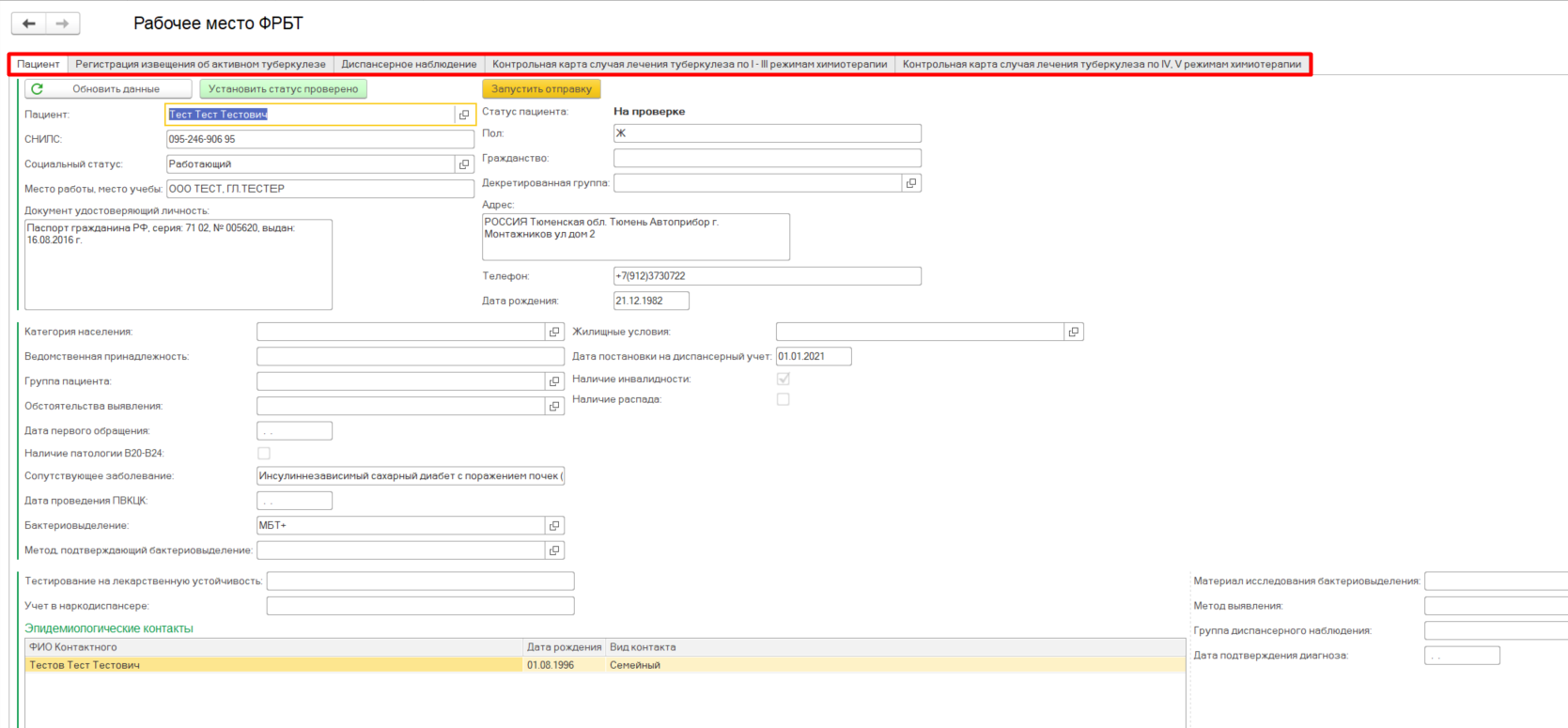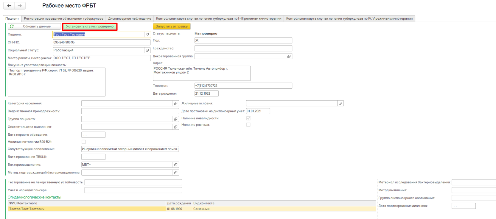 Ответственный сотрудник проверяет все данные о пациенте по полям и нажимает кнопку «Установить статус проверено».