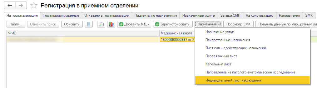Также создание документа доступно в «Пациенты в приемном отделении» – «Назначения».