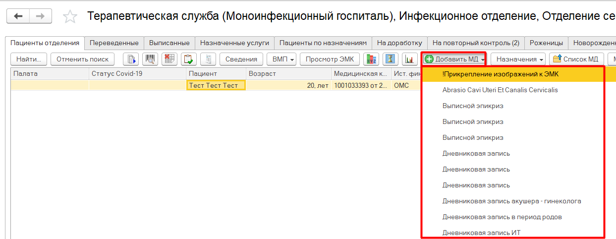 В процессе работы с пациентом отделения (например при проведении осмотров больного) у врача появляется необходимость формирования медицинских документов. Для этого следует в подсистеме «Отделение» -«Пациенты отделения» выбрать нужного пациента и нажать команду «Добавить МД» - после чего из списка выбрать необходимый медицинский документ.