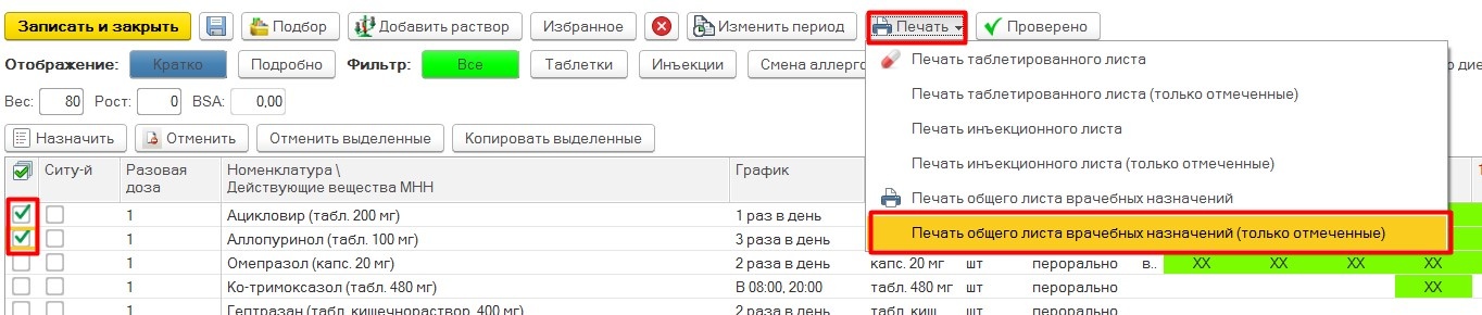 Для вывода на печать только части назначений из листа назначений, нужно установить галочку и выбрать печать с комментарием «только отмеченные».