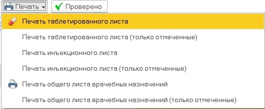 • Печать общего листа врачебных назначений – печатается лист с таблетированными и инъекционными препаратами.