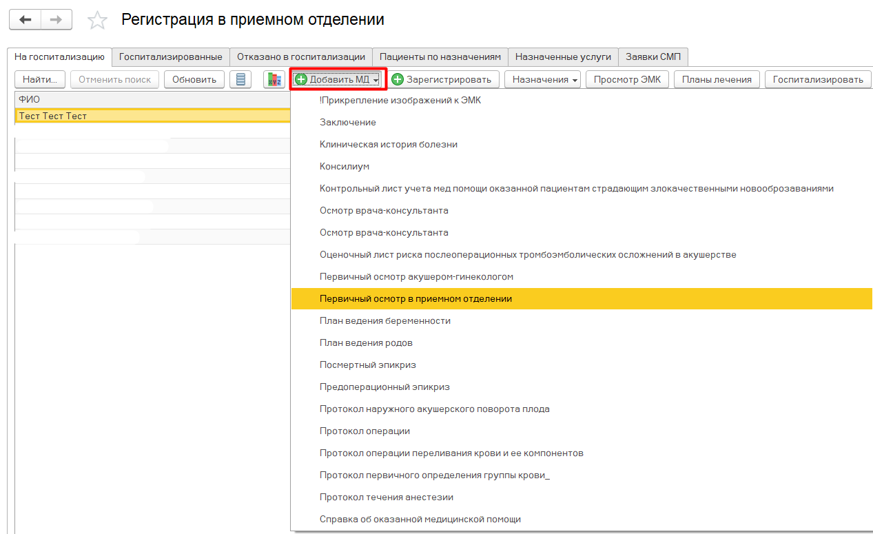 В процессе работы с пациентом приемного отделения (например при проведении осмотров больного) у врача появляется необходимость формирования медицинских документов. Для этого следует в подсистеме «Приемное отделение» - «Пациенты в приемном отделении» выбрать нужного пациента и нажать команду «Добавить МД» - после чего из списка выбрать необходимый медицинский документ.
