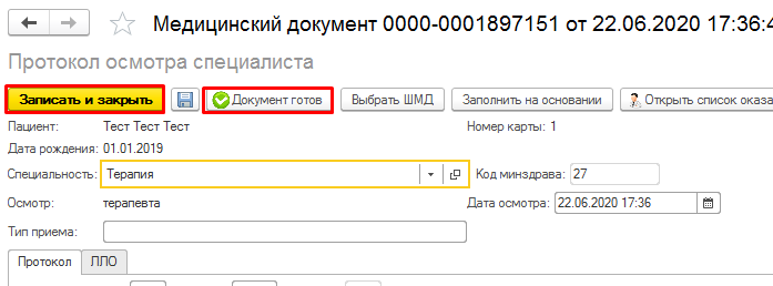Откроется окно «Протокол осмотра специалиста», которое необходимо заполнить данными. После заполнения всех необходимых полей для подписания документа нужно нажать кнопку «Документ готов». Если документ еще не готов и требуется заполнить его потом, тогда нажать кнопку «Записать и закрыть».