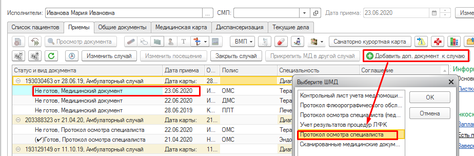 Чтобы добавить к случаю дополнительный мед.документ, необходимо выбрать случай или посещение, при этом дата приема должна совпадать с датой посещения. Далее нажать кнопку «Добавить доп. документ к случаю». Откроется «Форма выбора ШМД». На форме выбора ШМД врач выбирает необходимый мед.документ, например «Протокол осмотра специалиста».