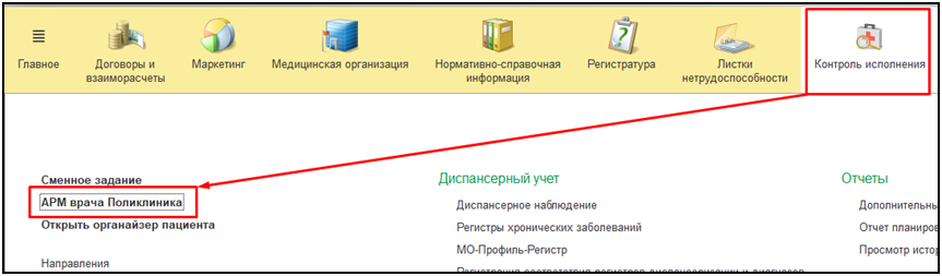 Для того, чтобы приступить к работе с функционалом шкал для врача-гериатра, необходимо войти в систему под правами «Врача амбулатории, СМП». Далее открыть подсистему «Контроль исполнения», перейти по ссылке «АРМ врача Поликлиники».