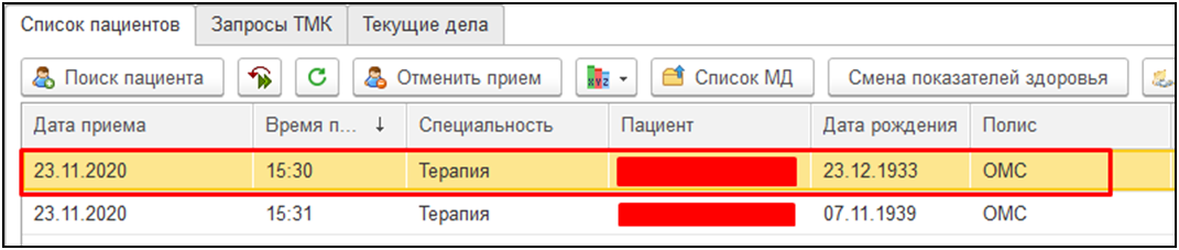 В списке выбирать нужного пациента, двойным щелчком мыши открыть форму приема.