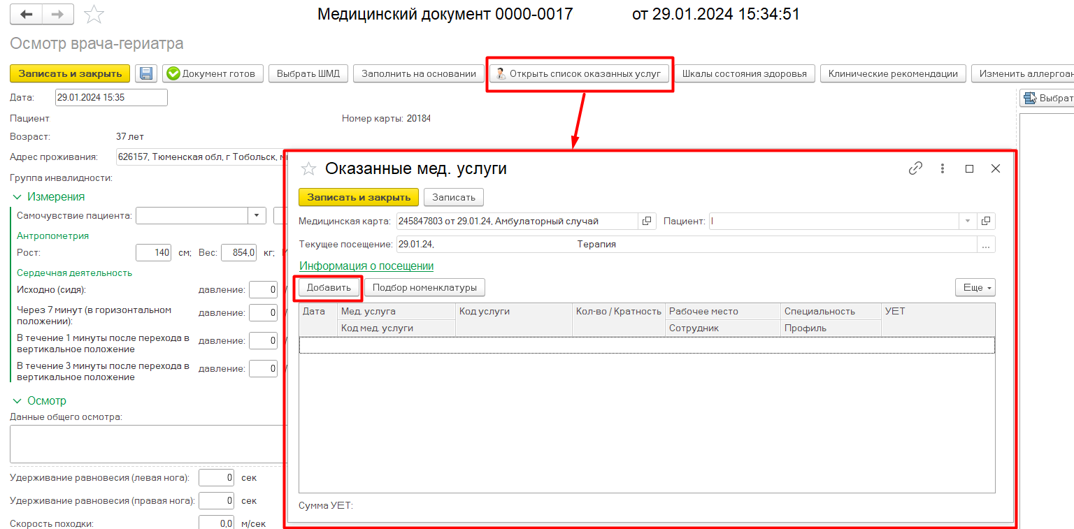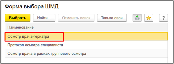 На вкладке «Прием» открыть случай или добавить посещение и на форме выбора ШМД выбрать «Осмотр врача-гериатра»