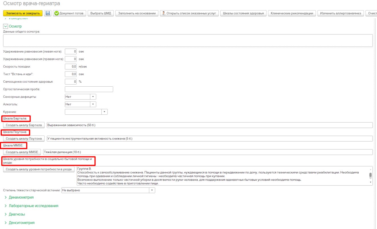 Во вкладке "Осмотр" заполняютися основные шкалы врача-гегиатора. Их можно создать как в самом документе, так и через "Шкалы состояния здоровья" 2.2.4.18.1 Оформление медицинских документов «Шкалы состояния здоровья»