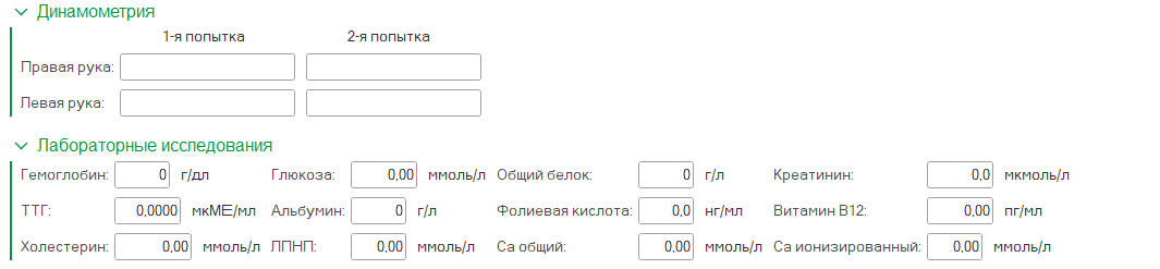 Во вкладках "Динамометрия" и "Лабораторные исследования" показатели заполняются от руки