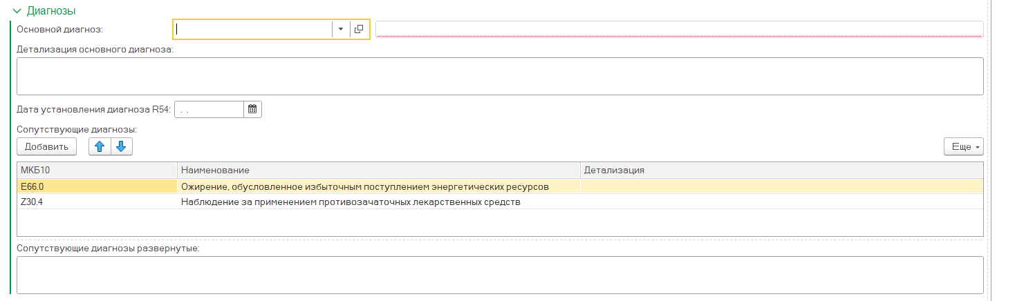 Во вкладке "Диагнозы" указывается основной диагноз. Сопутствующие диагнозы подтягиваются с органайзера пациента.