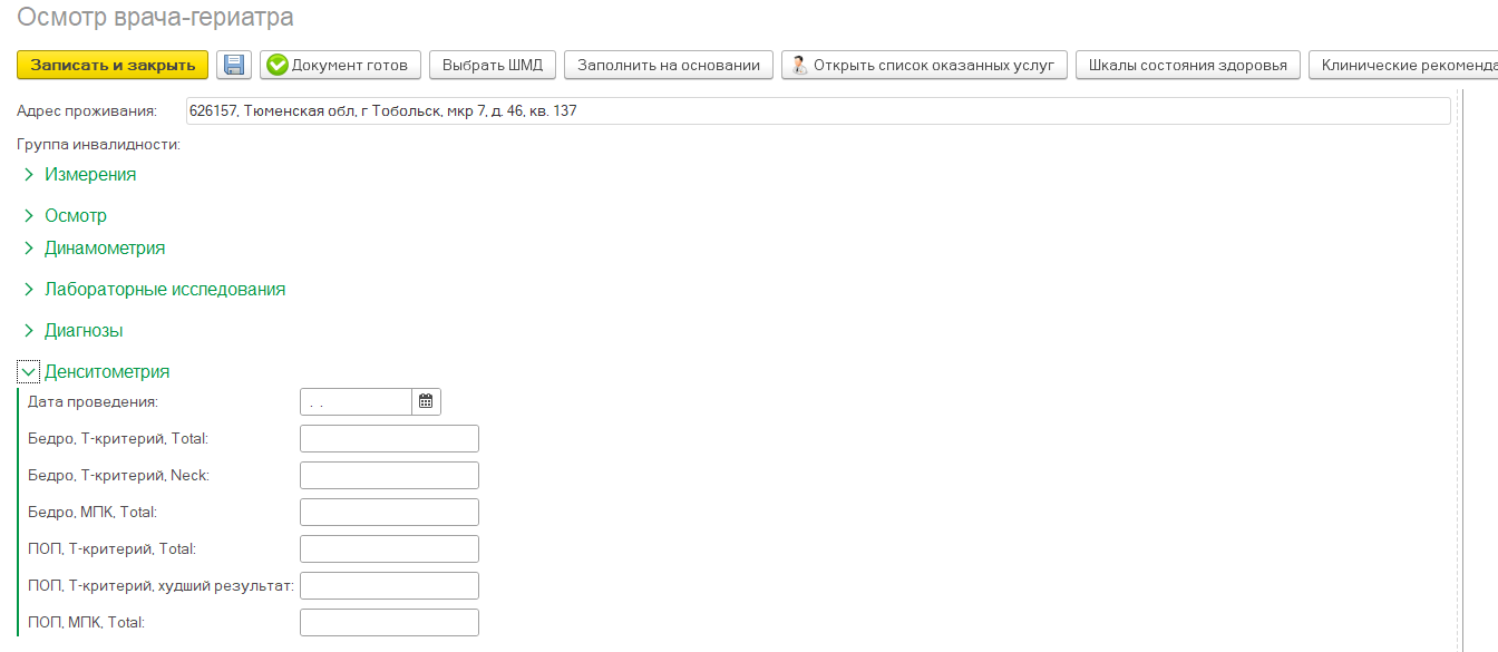 Во вкладке "Денситометрия" заполняются все необходимые поля