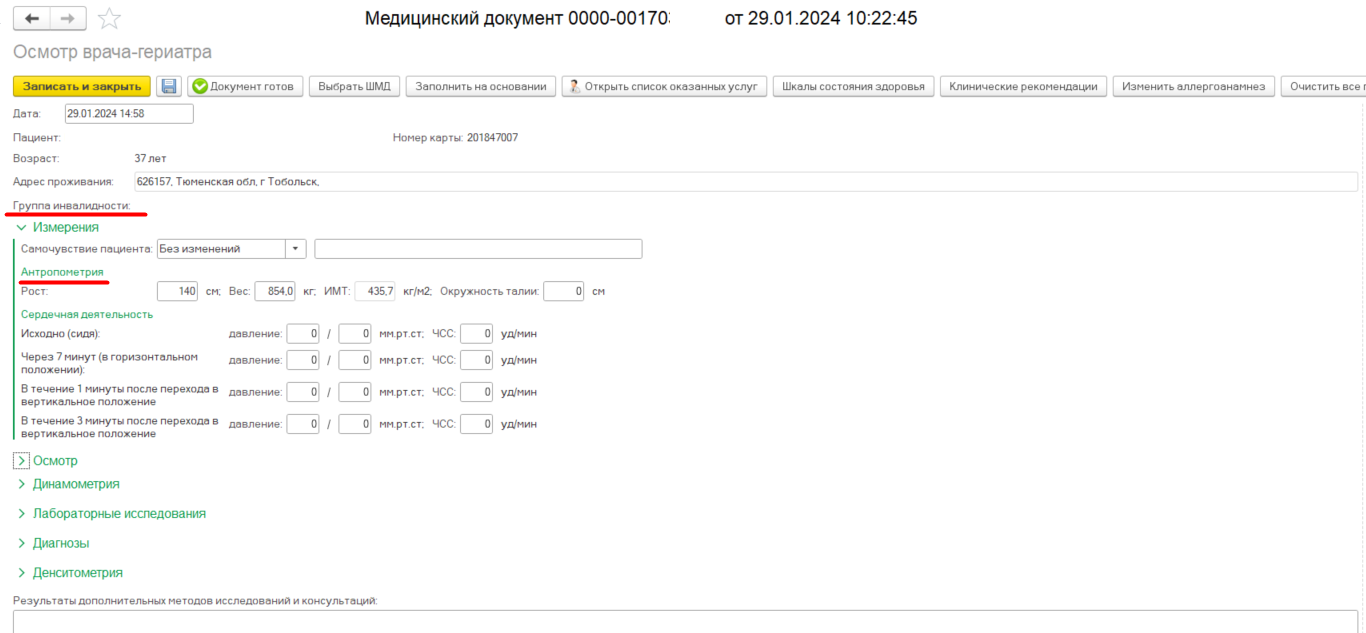 Группа-инвалидности и Антропометрия подтягивается автоматически, если в ОДП имеются данные.